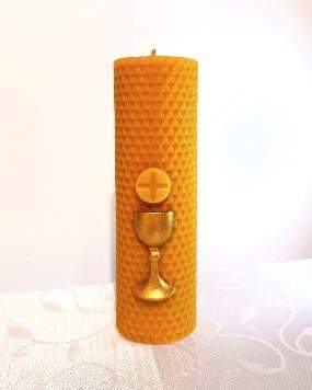 Świeca ta jest ręcznie zwijana z plastrów węzy pszczelej. Doskonale sprawdzi się jako oryginalny prezent dla dziecka, podkreśli też duchowy charakter uroczystości i będzie efektownym elementem wystroju podczas przyjęcia komunijnego. Jej naturalny kształt i złocisty kolor wprowadzą ciepło do każdego wnętrza, a zapach wosku pszczelego stworzy przyjemny, relaksujący nastrój.