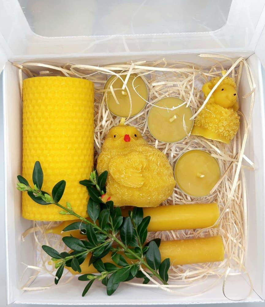 Zestaw prezentowy świec z wosku pszczelego Wielkanoc z gałązką bukszpanu zapakowany jest w białe pudełko fasonowe z okienkiem.